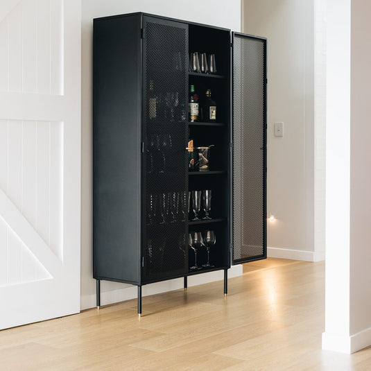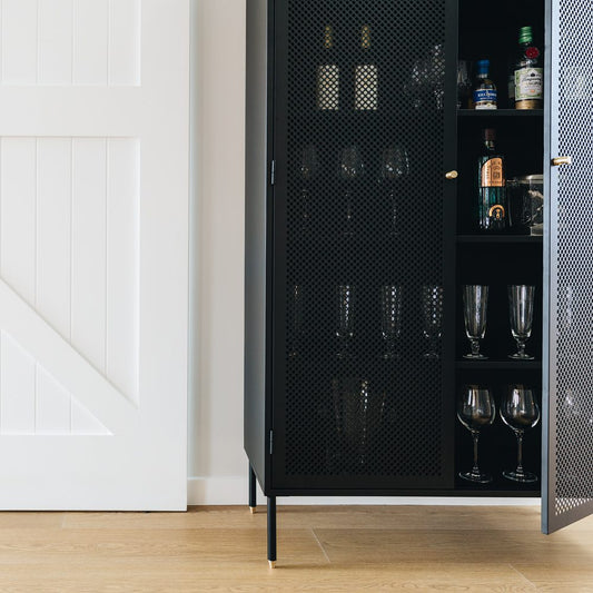 The Dawn range features powder-coated metal, perforated doors and brushed brass accents. Skilfully crafted from sturdy metal and a steel frame the Dawn exudes quality and makes a striking alternative to timber furniture.