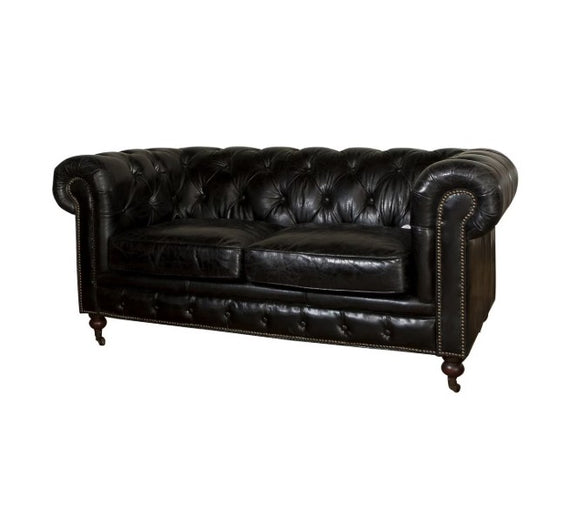 Offices and lounges would look amazing with the addition of this Hampton court 2-seater button back club chair in belon black. Crafted from the highest quality top grain leather in a classic chesterfield style with a natural leather finish with brass nail detailing, this comfortable chair adds a great deal of character to any contemporary, rustic, or vintage inspired space.