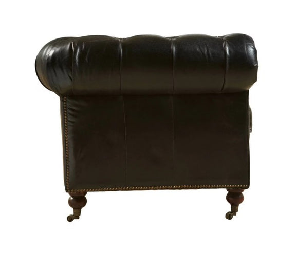 Offices and lounges would look amazing with the addition of this Hampton court 3 seater button back club chair in belon black. Crafted from the highest quality top grain leather in a classic chesterfield style with a natural leather finish with brass nail detailing, this comfortable chair adds a great deal of character to any contemporary, rustic, or vintage inspired space.