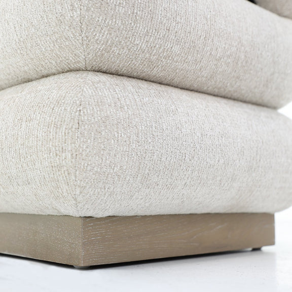 Upholstered in a durable polyester fabric, Kumo is designed to perform across both residential and light commercial settings, offering comfort, texture, and function in equal measure. A low timber plinth base grounds the piece, giving it a quiet architectural presence.