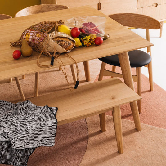 The Nordik Oak Bench was designed to match our Nordik Dining Table Collection offering a contemporary yet practical solution to your dining needs by seating 2-3 people. Crafted from solid white American Oak the bench sits between the legs of the Nordik Dining Table and able to be tucked in. Pictured with the Nordik Dining Table.
